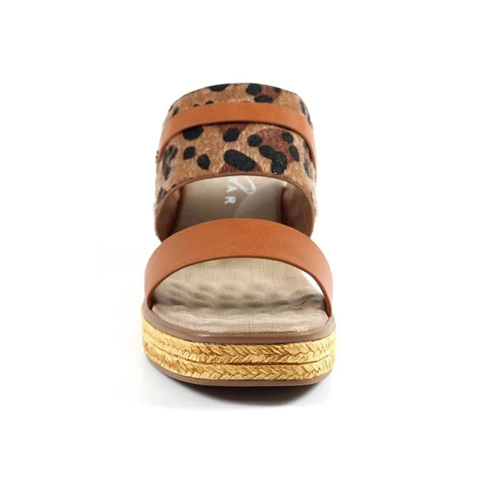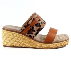 By Lunar, Saphira womens sandals in tan. Saphira is a fabulous wedged mule with a leopard print upper and a matching strap over the middle. The espadrille style sole compliments the ocelot upper and the padded insole ensures hours wear.