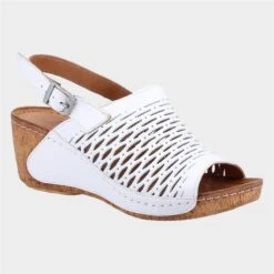 By Riva, Wrexham womens sandals in white. Elegant casual open toe wedge mule sandal from Italian inspired brand Riva. Comfortably designed with lightly padded leather foot bed and lightweight bark effect platform wedge heel.